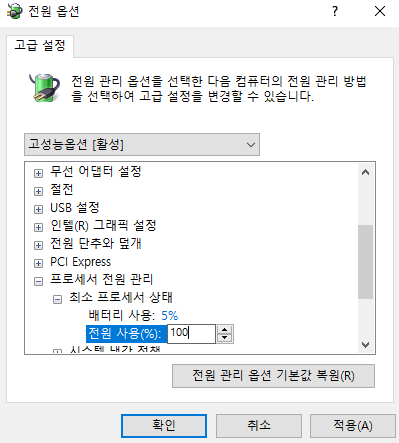 추가로 고성능옵션 설정변경 - 고급 전원 관리 옵션 설정 변경 - 프로세서 전원 관리 - 최소 프로세서 상태에서