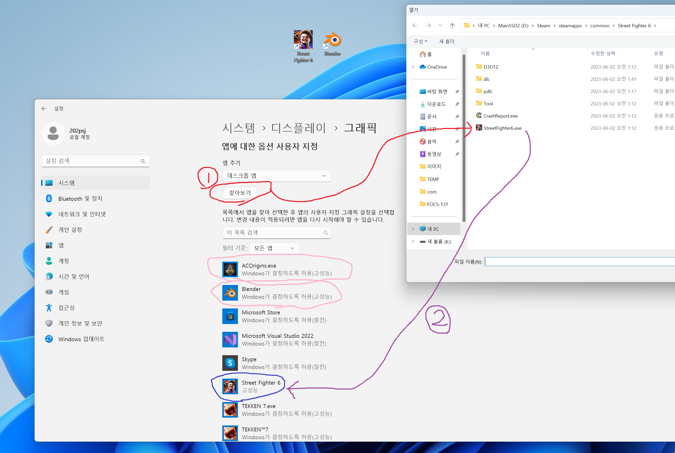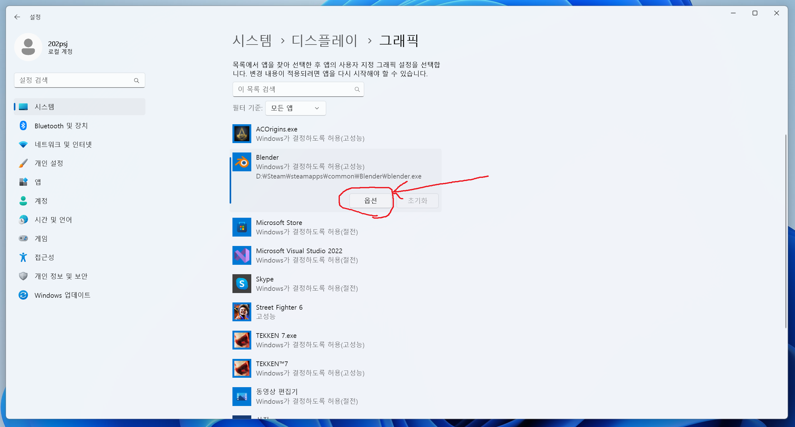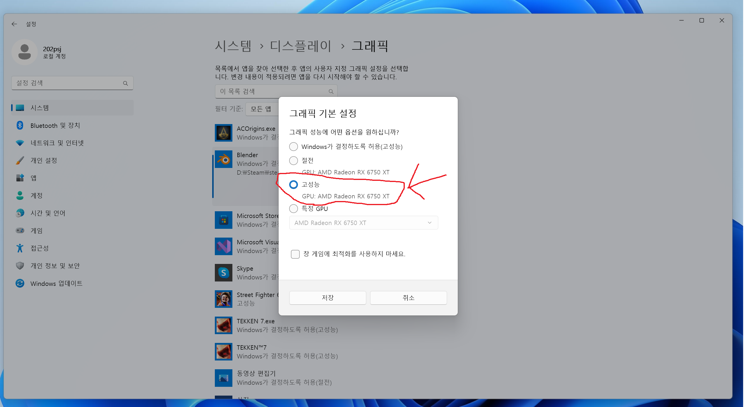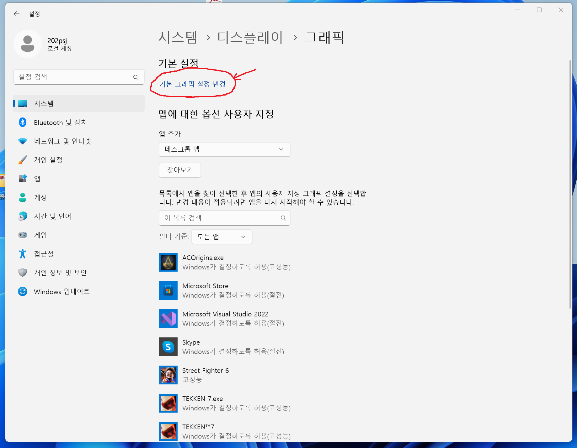 "디스플레이>그래픽 설정"에서 윈도우 특정 프로그램(앱)을 지정하여 성능올리기