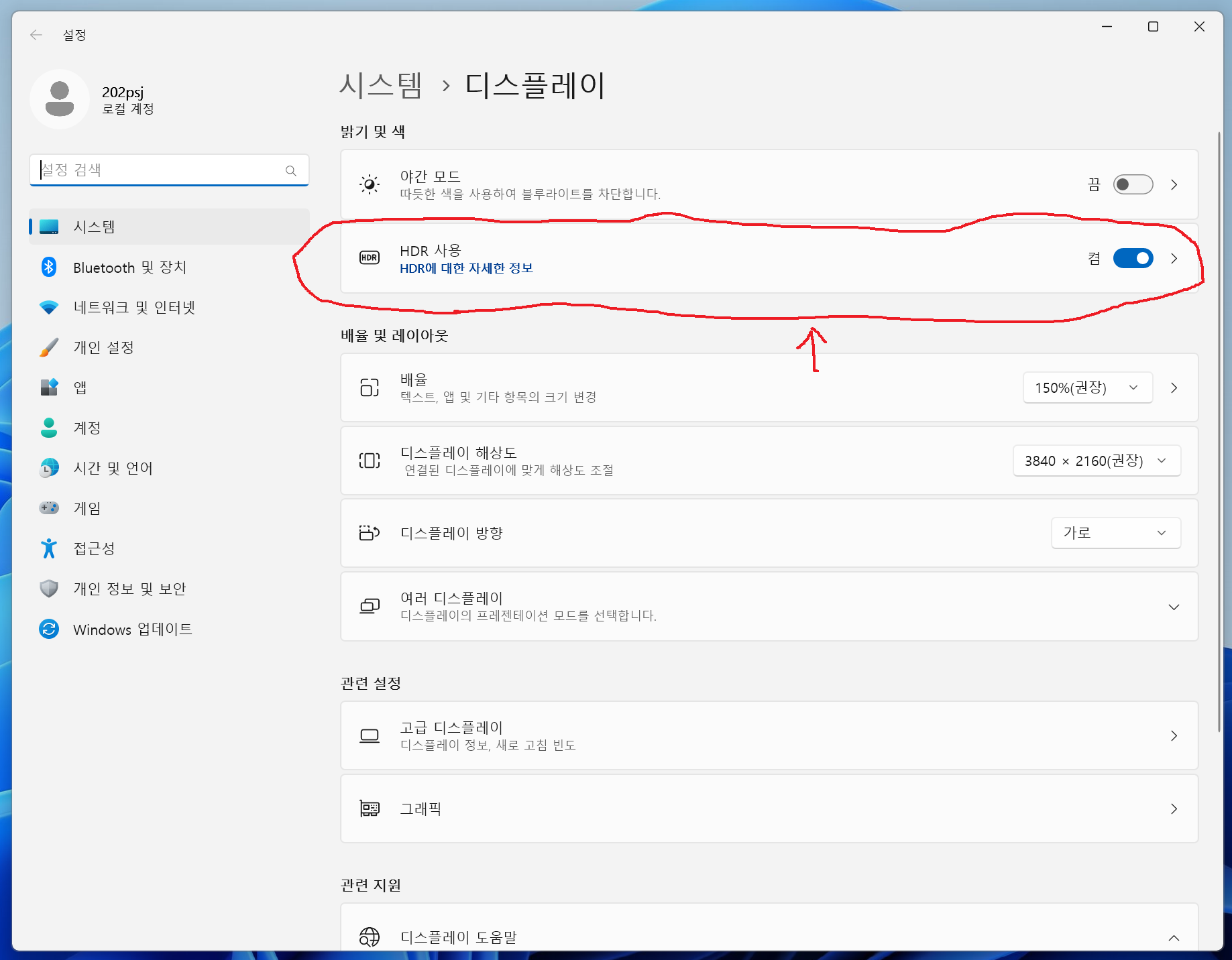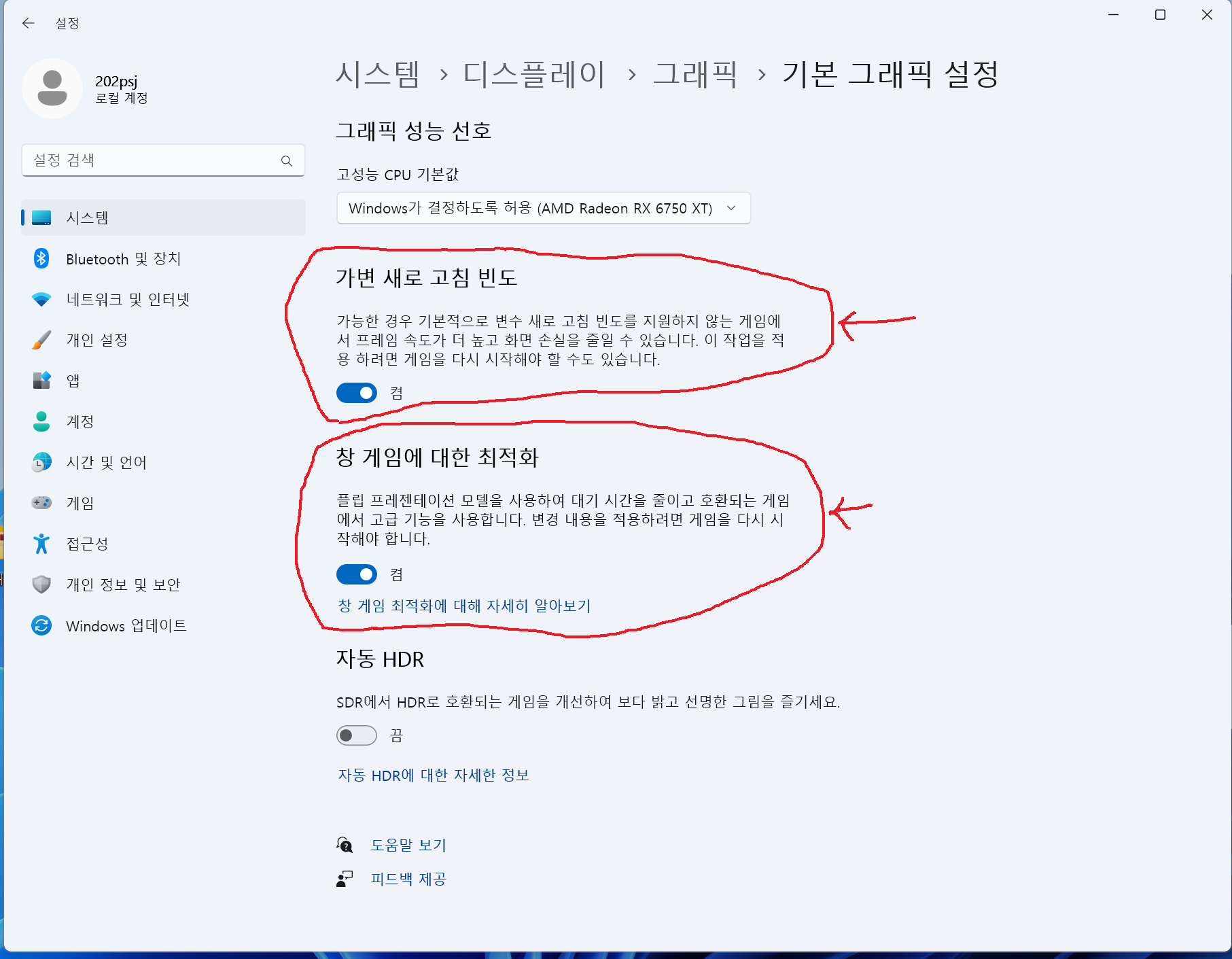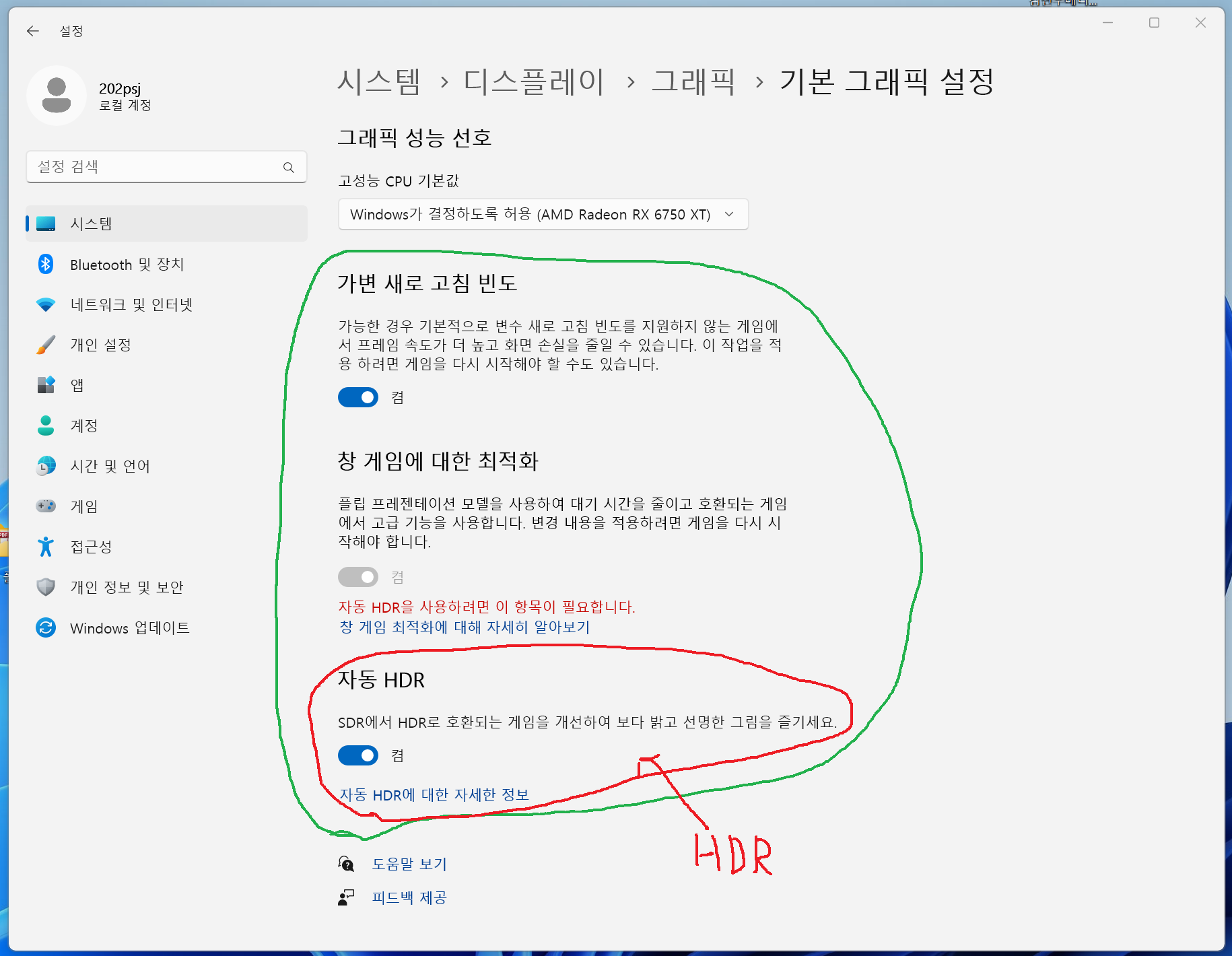 HDR 기능을 활성화 하는김에 "가변 새로 고침 빈도", "창 게임에 대한 최적화" 의 기능도 활성화 해주면