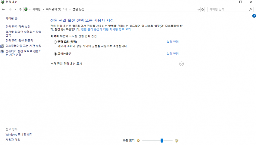 고성능옵션으로 바꿔줌. 고성능옵션이 안뜨면 [추가 전원 관리 옵션 표시] 눌러보면 뜰것임.