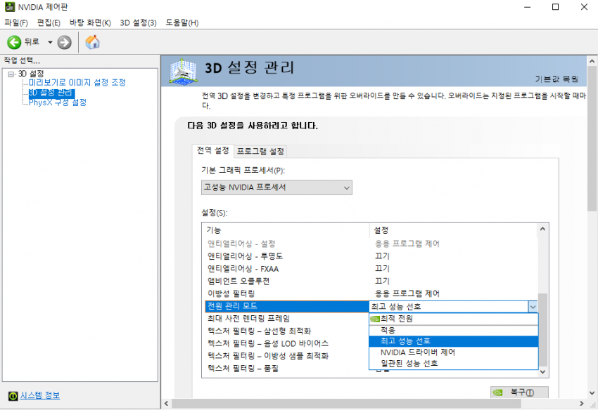3D 설정 - 3D 설정 관리 - 전역설정을 [ 고성능 NVIDIA 프로세서 ] 로 바꾸고,
