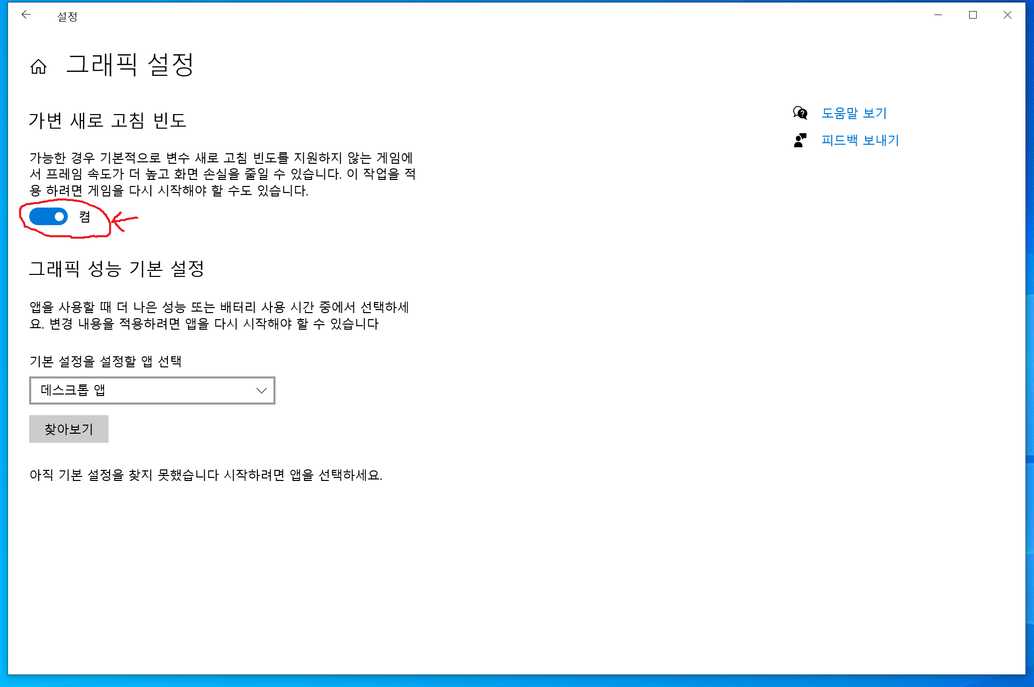 "윈도우10"의 경우 "그림3"과 같이 창에서 "가변 새로 고침빈도" 부분의 빨간 표시부분과 같이 기능을