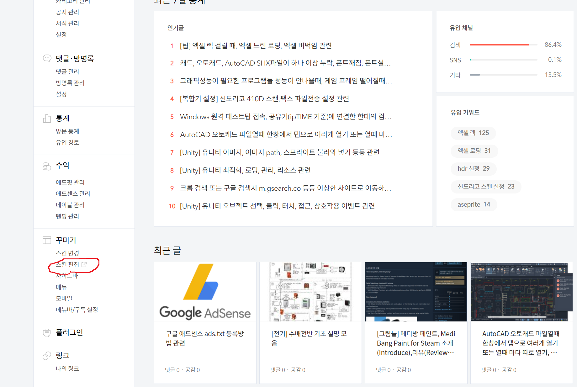 그후 "스킨편집>HTML편집" 을 눌러준다