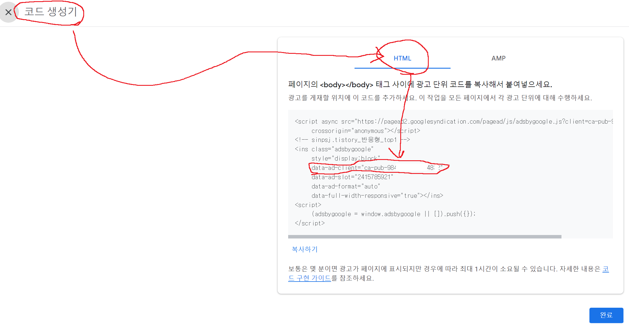 빨간표시의 게시자ID [pub-*******************] 부분만 복사해서
