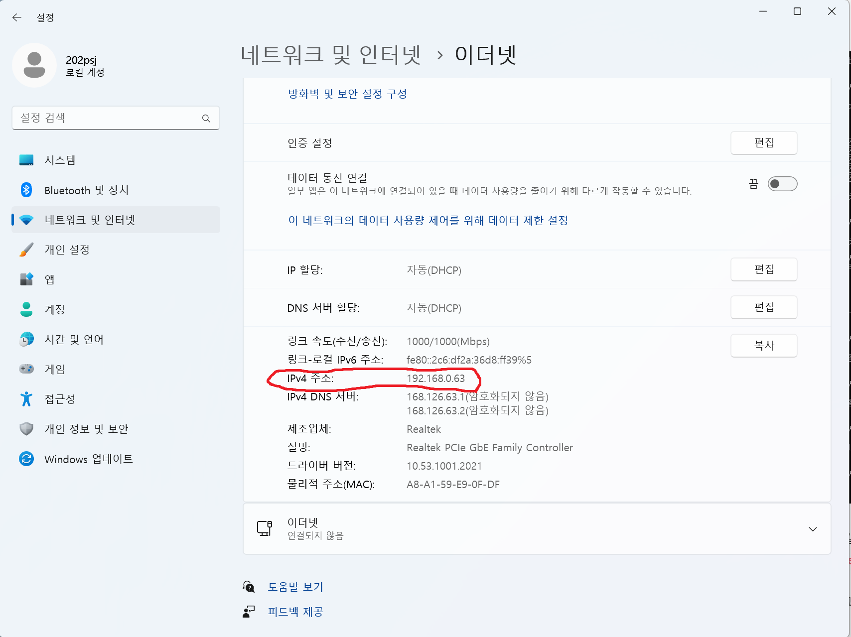 고정설정한 "192.168.0.63" IP주소로 바뀐걸 확인할 수 있다.