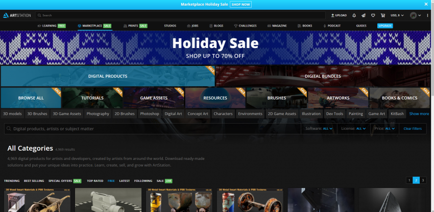 아트스테이션은 유료 에셋도 팔지만 무료 에셋도 꽤 많음. 여기는 처음부터 라이센스에 따라 유로/무료로 나눠져 있음