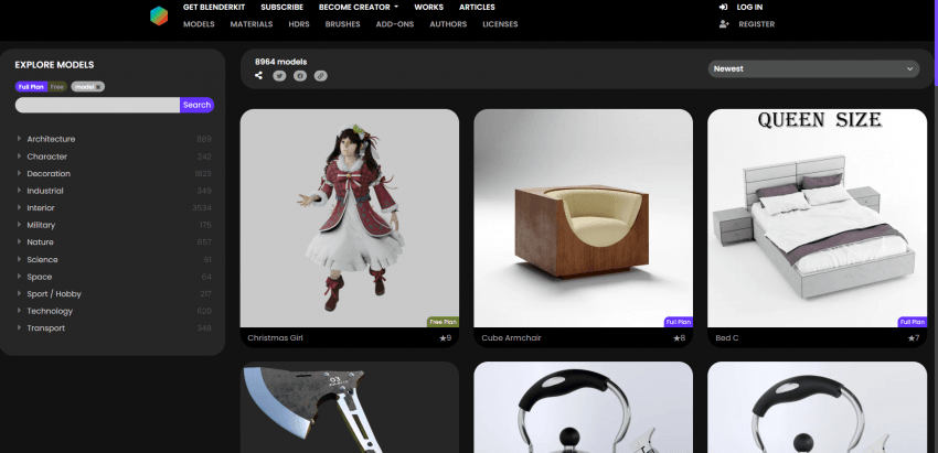 약간 상업적인 느낌이 많이 나는 모델링들이 많아. 유료탭으로 가면 전체적으로 가격이 비싸지만, 여기도 무료 모델을 제공하기는 해.