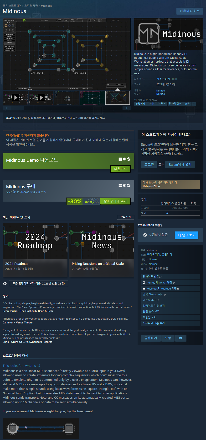 Midinous는 가끔씩 등장하는 정말 특별한 MIDI 시퀀서 중 하나로, 제가 음악을 만드는 방식을 완전히 다시 작성해 줍니다. 세미 모듈식 그리드와 내장된 기능을 통해 Midinous를 사용하면 제가 결코 달성할 수 없거나 기존 시퀀싱 도구를 사용하여 생성하기가 극도로 어려운 MIDI 시퀀스를 구성할 수 있습니다. 나는 가능성에 압도당했고 개발자가 미래에 Midinous를 어디로 데려갈지 보고 싶습니다. MIDI로 어떤 종류의 음악을 만드신다면 적극 추천합니다!