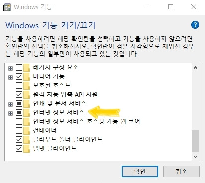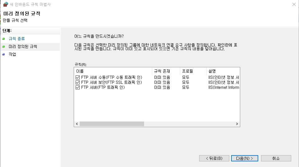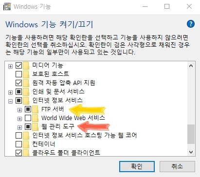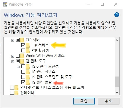 첫번째 FTP 서비스 와 맨하단에 IIS 관리 콘솔에 체크후