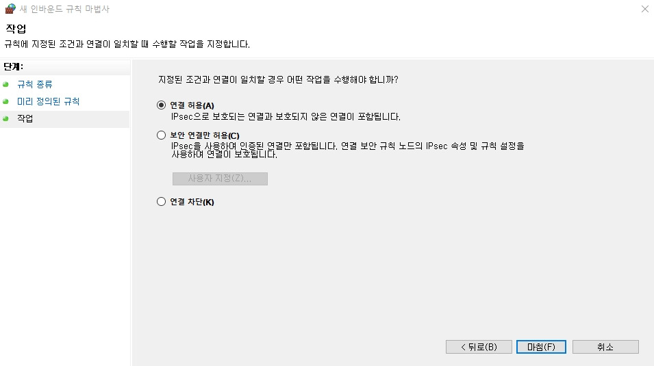 마침(F)을 눌러주시면 방화벽 및 설정이 끝나게 됩니다!