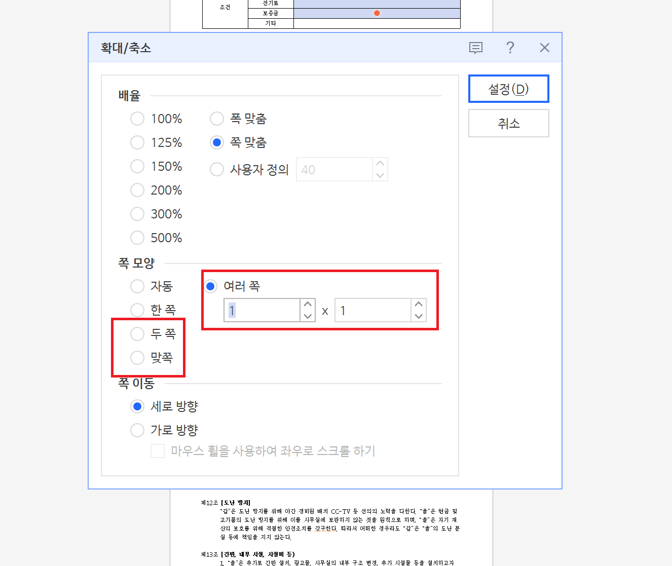 또한 그림F와 같이 다른식의 Zoom레이아웃으로 "여러쪽"이나 "두쪽", "맞쪽"으로 다양하게
