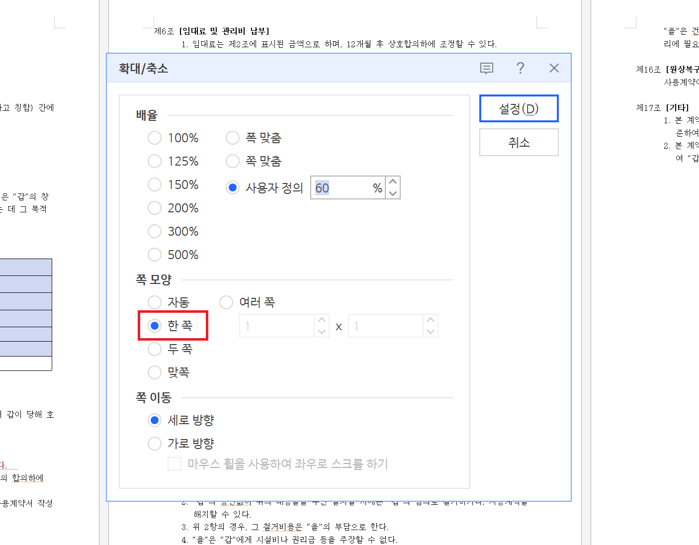 그림D의 빨간색 표시 부분과 같이 "한 쪽"으로 설정해주면 한페이지씩 페이지레이아웃이 된다.