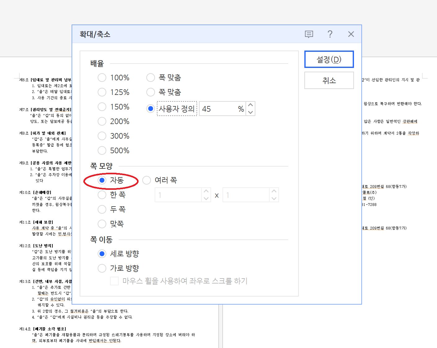 그림C와 같이 쪽모양이 기본적 설정이 "자동"으로 되어있다 이렇게 되어 있으면