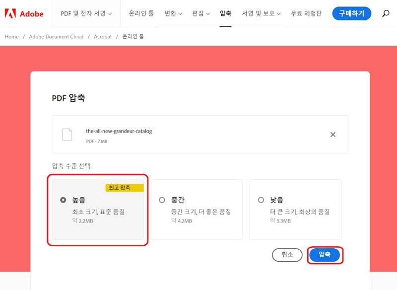 파일의 압축 수준을 설정하는 메뉴가 뜨는데, 이는 어도비 온라인 서비스와 마찬가지로, 압축 수준이 높을수록 용량은 줄어들지만 이미지 품질 저하도 심해집니다. 이번에도 압축 수준은 ‘높음’으로 선택했습니다.