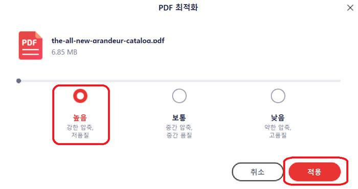 PDF 압축 수준을 선택한 뒤 ‘적용’을 누르면 파일 압축이 시작됩니다