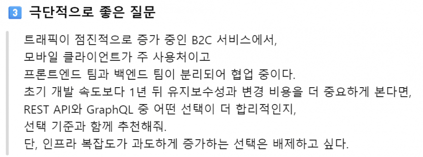 - ⭕ 좋은 질문: "1년 뒤 유지보수성과 인프라 복잡도 제한을 고려할 때, B2C 모바일 중심 서비스에 적합한 프레임워크를 추천하고 기준을 명시해 줘."